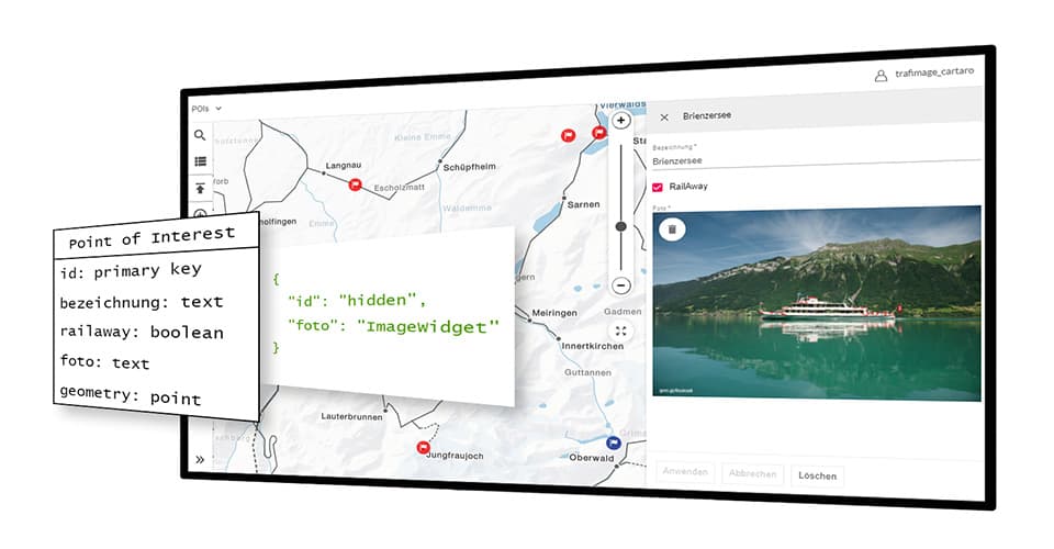 Die Kernfunktion von Cartaro ist die automatische Erzeugung von Erfassungsformularen auf Basis von Datenbank-Tabellen. Auf Basis des Datenmodells generiert Cararo automatisch ein JSON-Schema, welches anschliessend vom Client in ein Formular "übersetzt" wird. Standard-Felder, wie Checkboxen, Eingabefelder und Drop-Downs, lassen sich durch Überschreiben des Schemas einfach durch eines der zahlreichen Cartaro-Widgets, z.B. für den Bild-Upload, ersetzen. Es können flexibel weitere Widgets für beliebige Datenformate in Cartaro integriert und die Felder zugunsten der Übersichtlichkeit verschachtelt werden. Die Geometrie-Bearbeitung erfolgt über die Kartenansicht. Dank des integrierten OpenLayers Editors lassen sich beliebige Geometrien erstellen, bearbeiten und mit Snapping-Tools aneinander ausrichten.